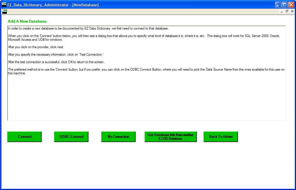 One of the most common administrative tasks accomplished using the EZDD_Admin module is to add a source database to the EZ Data Dictionary® database, and to generate basic metadata for that database. This example will show how to link to the Northwind test database in SQL Server and import the definitions provided in the initial EZ Data Dictionary® installation. Start by clicking the Add a New Database button to continue.