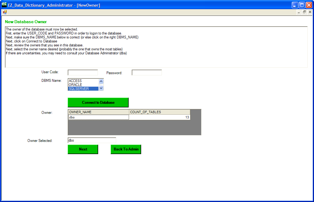 If a username and password are required to connect to the SQL Server enter these here. Select the database owner for the Northwind database and click Next to continue.