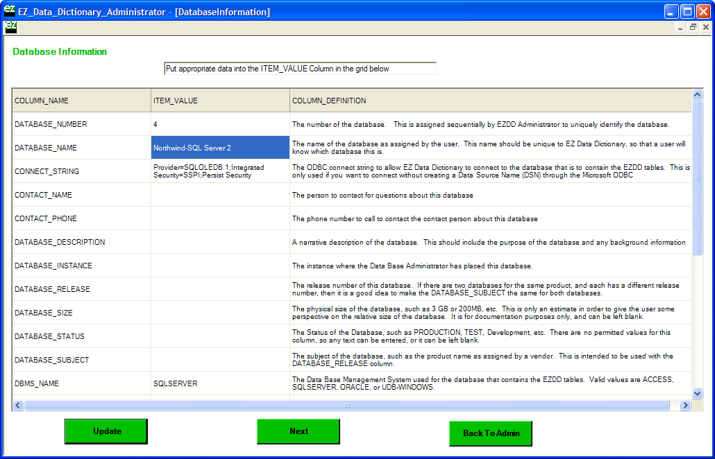 The Database Info window displays possible documentation and their descriptions for the database. Make sure to give the database entry a name with the DATABASE_NAME cell. Press the Update button to save any changes made and click the Next button to continue.