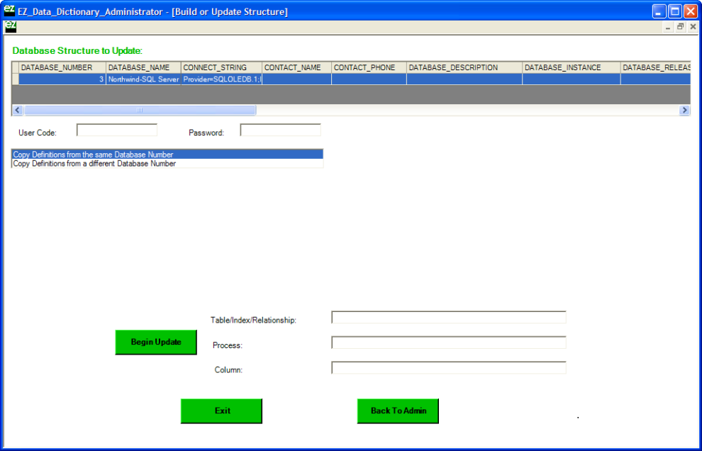 EZ Data Dictionary® generates metadata about the database structure by directly analyzing the source database itself, indicated by the option to Copy Definitions from the same Database Number, as illustrated below. Optionally this information, along with database structure descriptive information, can copied from another source database that has already been defined and stored in the EZ Data Dictionary® database. An example of this is in the section Build Or Update DB Structure. Click the Begin Update button to start the process. When completed, click the Go Back button to return to the main EZDD Admin screen.