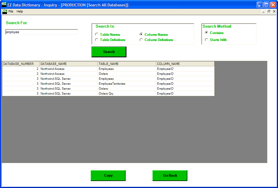 From the main screen in EZDD_Inquiry, the Search All button will direct the user to a screen where a search can be performed across all the databases included in the EZDD database. The user can define the character string to Search For, the elements to Search In and the Search Method. The Search button will perform the search and display the results at the bottom of the screen. The Copy button will copy the results to the clipboard.