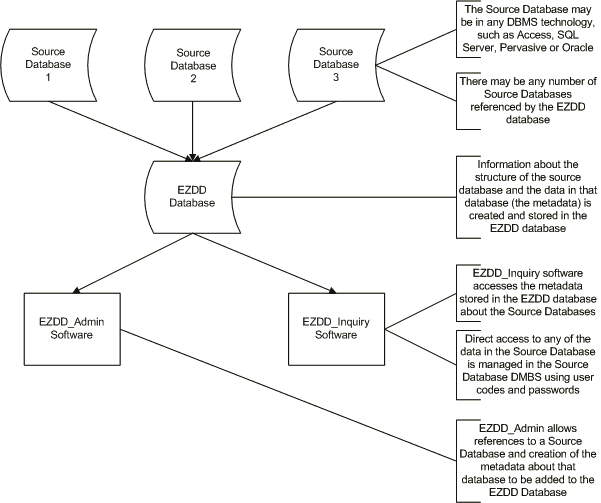 EZ Data Dictionary® can create and store metadata about any desired database. The metadata is information about the database, including its structure and descriptive information about its data. The metadata that is captured for any database using EZ Data Dictionary® is stored in the EZ Data Dictionary® Database using a data structure that is friendly and easy to understand. It can easily be accessed and used to do customized or standard reporting. Databases in virtually any database technology can be documented in the EZ Data Dictionary® Database. The default installation of EZ Data Dictionary® will store the EZ Data Dictionary® Database as a Microsoft Access® Database, but even this database can be stored in other database technologies such as SQL Server® or Oracle®.