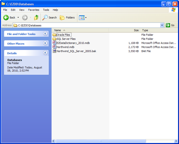 The Databases folder contains all the information necessary for EZ Data Dictionary® to access the three databases included in the default installation. The Programs folder includes all the files necessary to run the application.