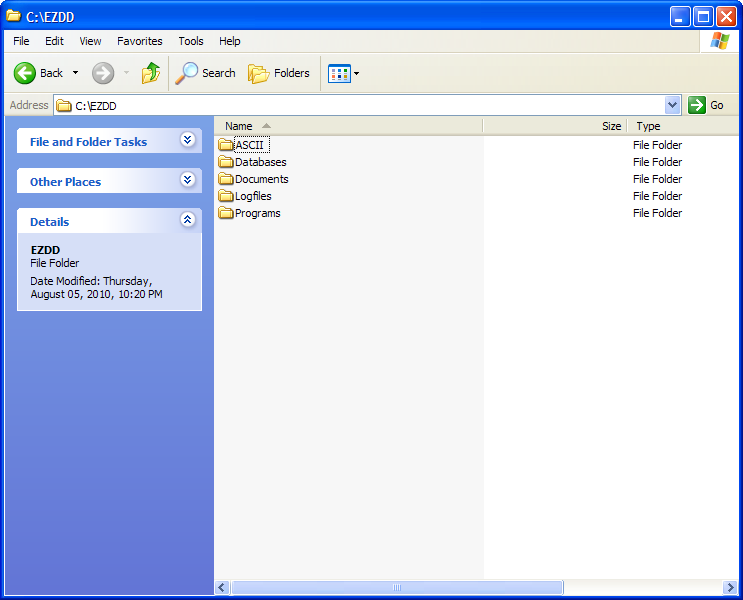 By default the EZ Data Dictionary® application will install to the C:\EZDD directory. This location may be changed by specifying a different directory during the installation process. The installed directory will contain the following five subdirectories: ASCII, Databases, Documents, Logfiles, and Programs.