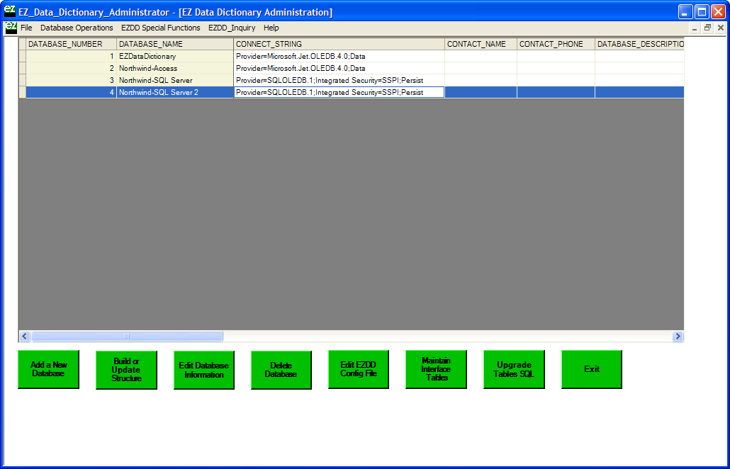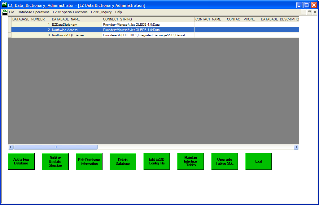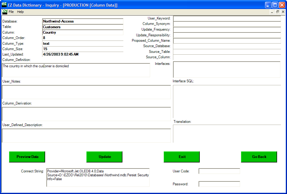 The metadata for the new source database is now ready to be accessed using the EZDD_Inquiry module and includes a copy of the definitions packaged with EZ Data Dictionary® for the Northwind database.
