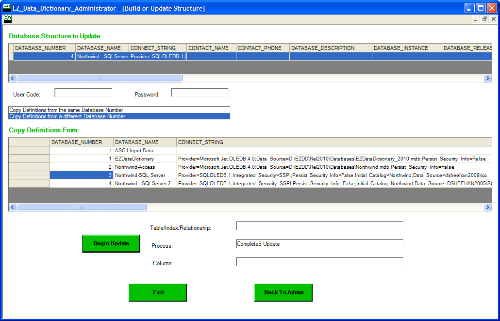 EZ Data Dictionary® generates metadata about the database structure by directly analyzing the source database itself. Optionally this information, along with database structure descriptive information, can copied from another source database that has already been defined and stored in the EZ Data Dictionary® database. Press the Begin Update button to start the process. When it is finished click the Go Back button to return to the main EZDD Admin screen.