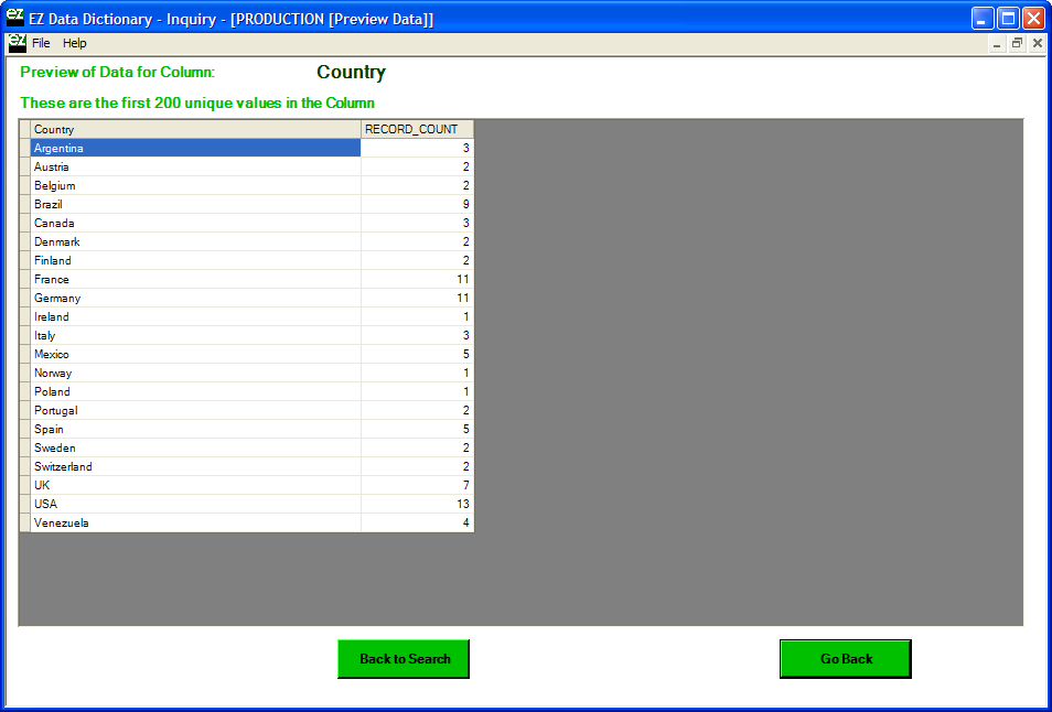 The Column Data screen will display the Connect String for the source database, for the user to verify that this is the desired database. Unless Windows Authentication is used for the source database, it is likely that a User Code and Password will need to be supplied for access to the data, and this is done in the indicated spots on the screen. Then click on the Preview Data button and if all information supplied is correct, EZ Data Dictionary® will retrieve the data from the source database to be displayed on the next screen. The first 200 unique values in the database will be shown with a count indicating how many of each value occurs.