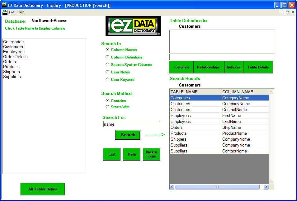 Navigating through the metadata for information related to a table in a source database is enhanced by use of the Columns, Indexes and Relationships buttons on the right panel of the EZDD_Inquiry Search screen.